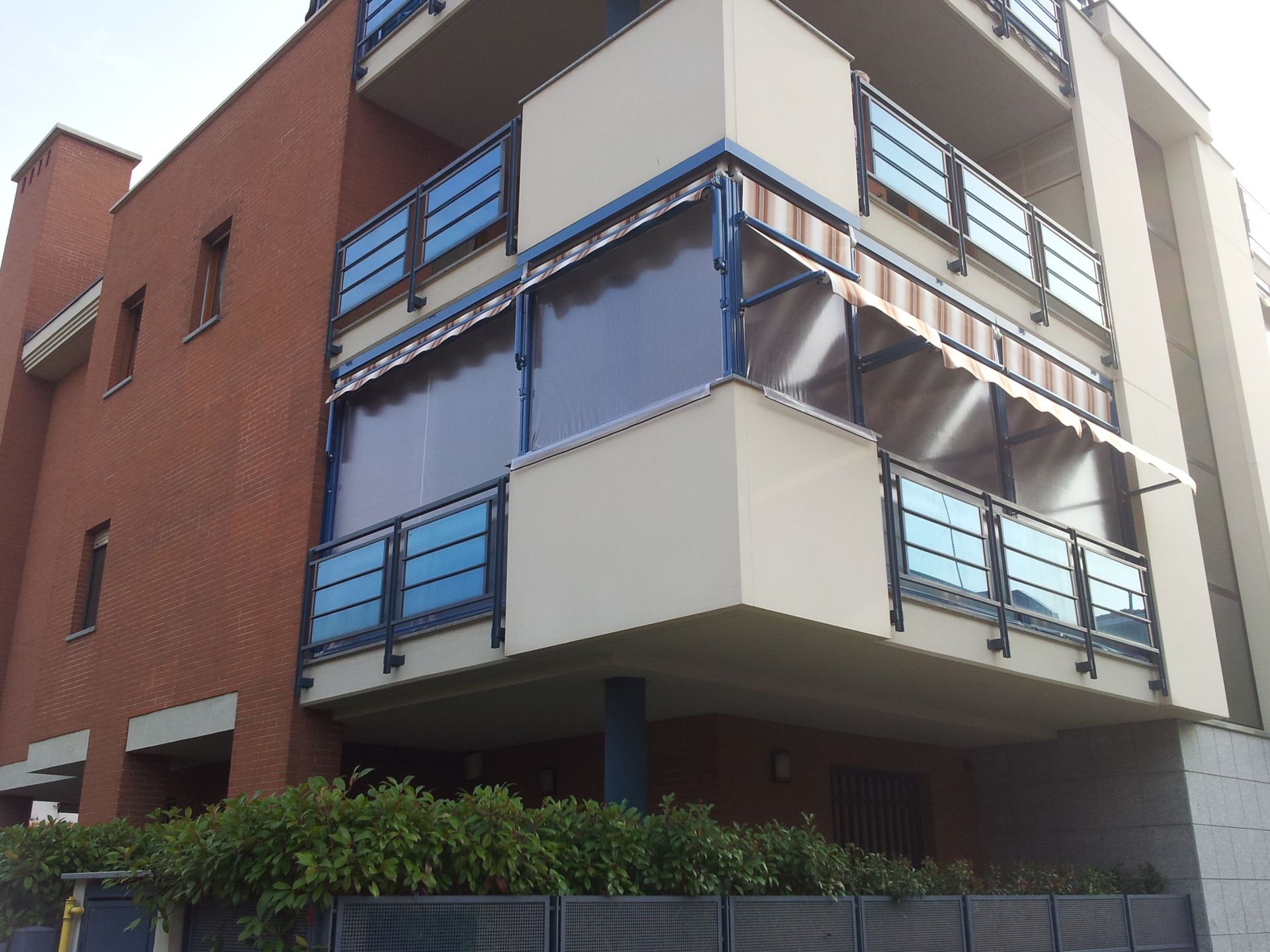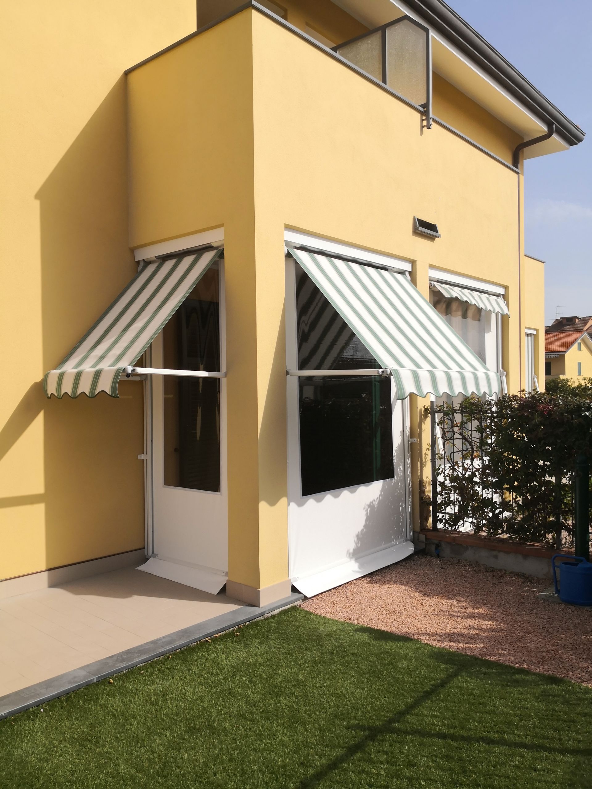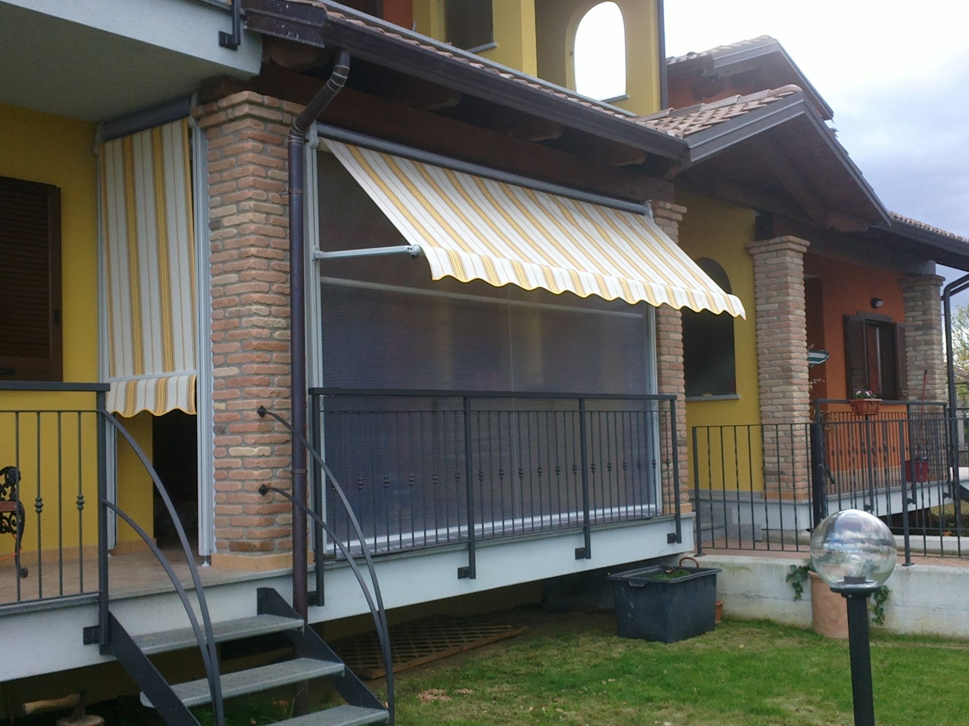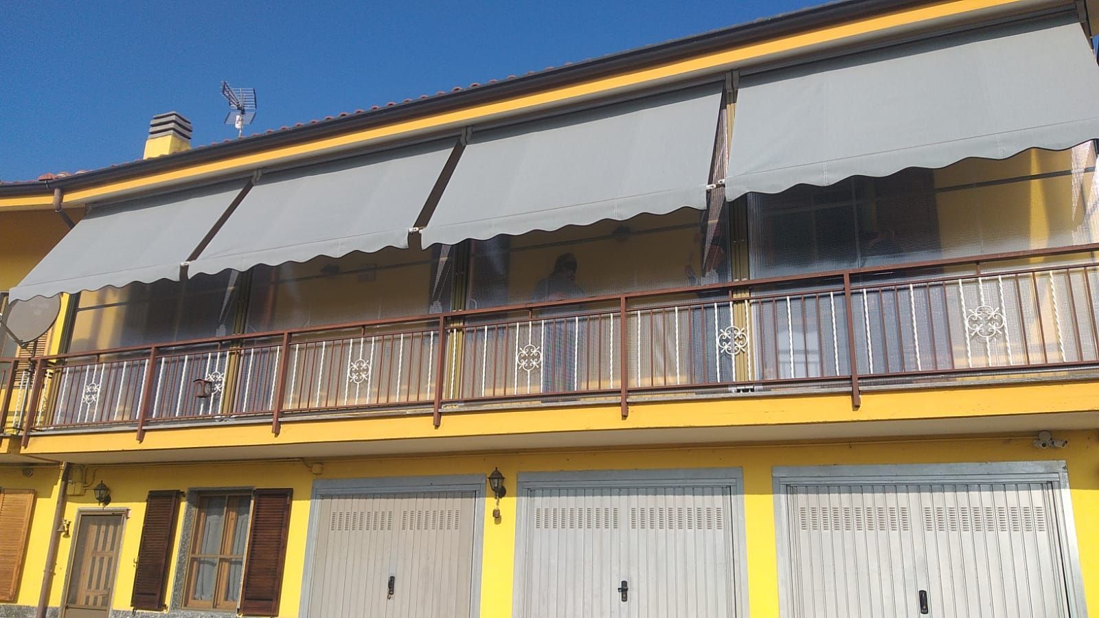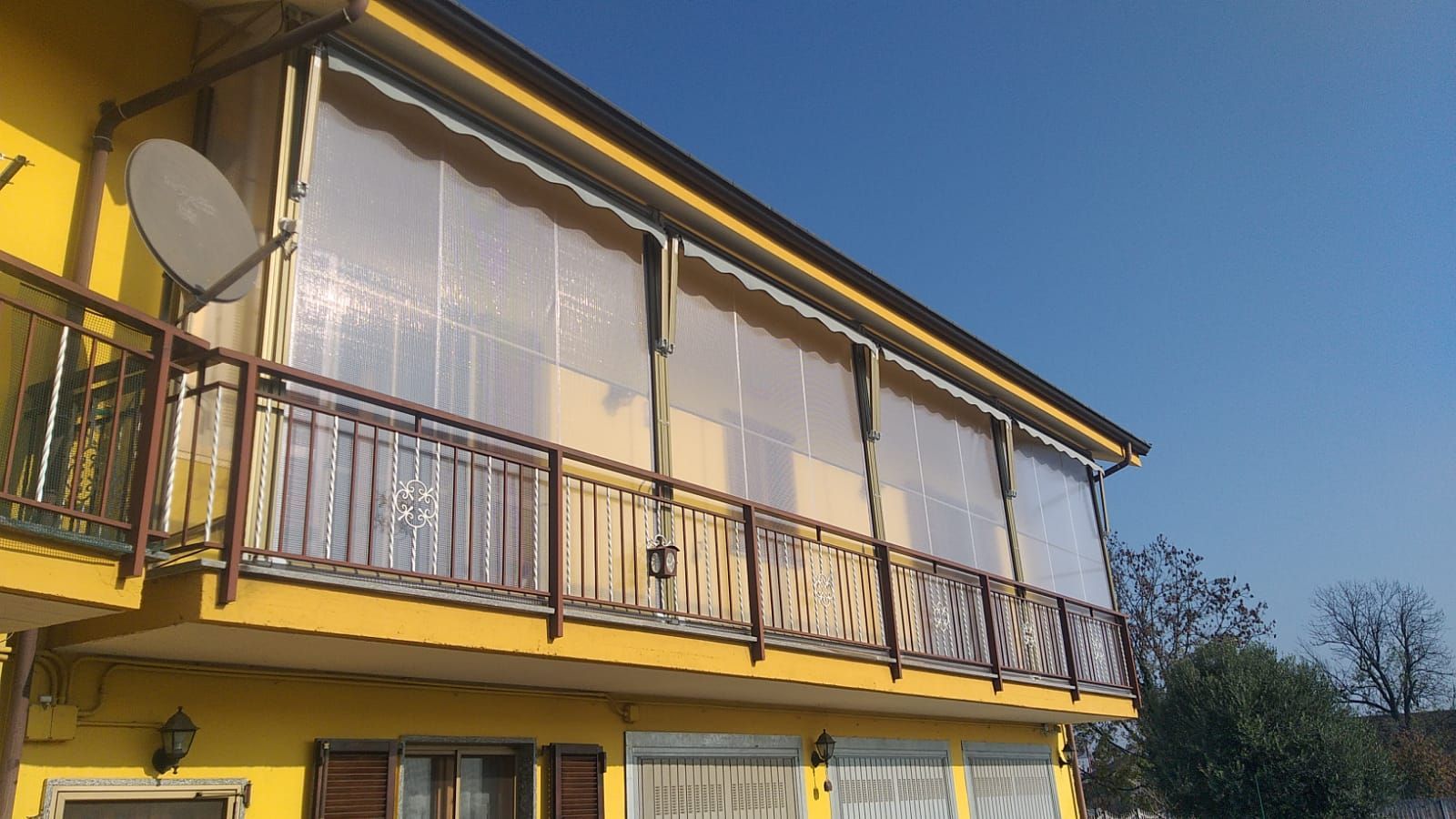 Composta da due rulli superiori indipendenti installati su guide verticali, garantisce la giusta temperatura, fresca d’estate, con l’apertura del tessuto estivo mediante bracci esterni che ruotano di 180° e chiusura del balcone d’inverno con telo in P.V.C. retinato trasparente che scorre nelle guide. Solida e robusta garantita contro le intemperie e, mediante la barra frangivento interna e spazzolino fermatelo , una barriera contro il vento.